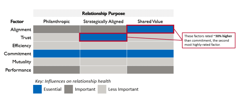 On the other hand, the health of shared value partnerships — intentional investments into societal issues that strengthen a company’s competitive advantage and potential for profit — rely more heavily on alignment of interests, goals and objectives, with respondents again rating it 30 percent higher than commitment, the second most highly rated factor. These partnerships often require shared decision-making and close coordination in the development of project scope, inputs, outputs, and outcomes of project activities.