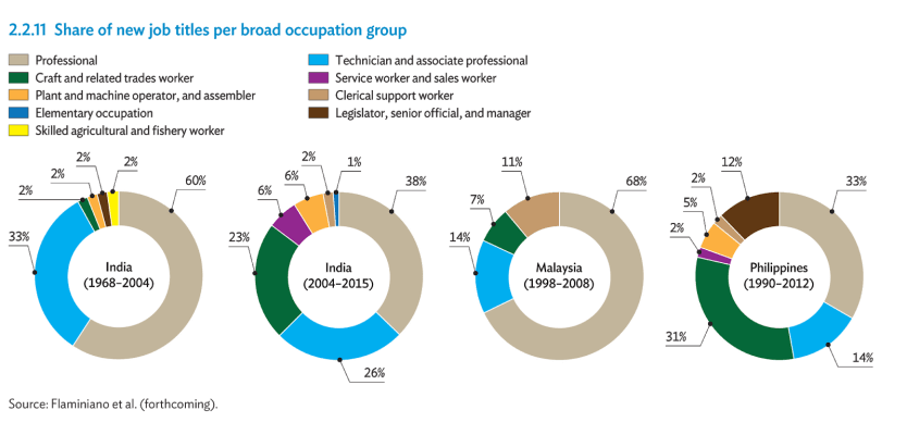 Based on an analysis of employment changes in 12 select economies in Asia, the report finds that most of the new job titles created through the introduction of technologies up to 2015 appear “primarily in professional categories.” In India, for example, 93 percent of all jobs generated from 1968-2004 by the advent of technology are in the professional sector, and most of them require the use of computers and ICT knowledge: software engineer, system programmer, database design analyst, computer system hardware analyst, computer quality assurance analyst, and computer security specialist. Between 2004 and 2015, job titles have also emerged in nonprofessional categories, but these continue to require some sort of knowledge on ICT — such as smartphone repair technicians or those installing solar panels.