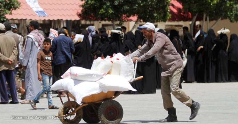 A worker carries sacks of food aid provided by the World Food Programme for distribution in Sanaa, Yemen. Photo by: Mohamed al-Sayaghi / Reuters